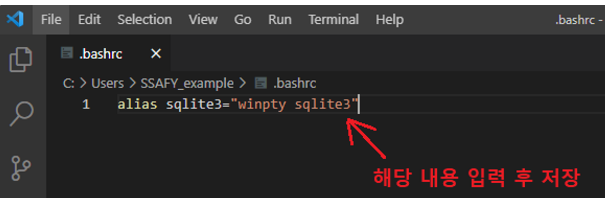 4. git bash 실행하여 code ~/.bashrc 입력, 실행 된 vscode에서 alias sqlite3="wipty sqlite3" 입력 후 저장