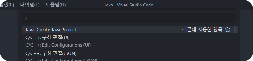 1. 명령 팔레트 창 (ctrl + shift + p) 을 열어 "Java: Create Java Project..." 를 선택