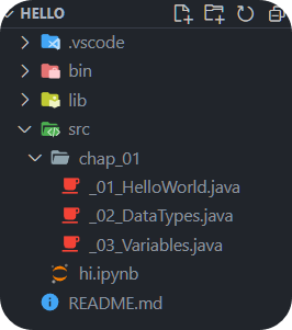 - 위 VScode 세팅 4번 이미지와 같이 src 폴더 안에 chap_01이라는 패키지를 생성하여 진행하였다.