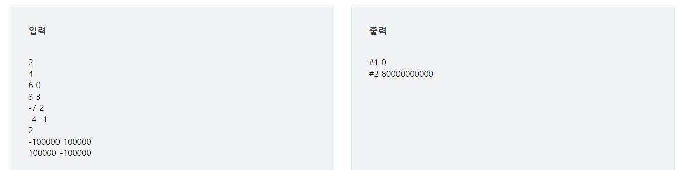 예시의 입출력을 확인하니 입력받은 값(x ,y)의 절반은 (-x, -y)로 바꾸어 x, y값을 각각 모두 더한 후 벡터의 크기를 계산하였을 때 가장 작은 값을 출력하였다.